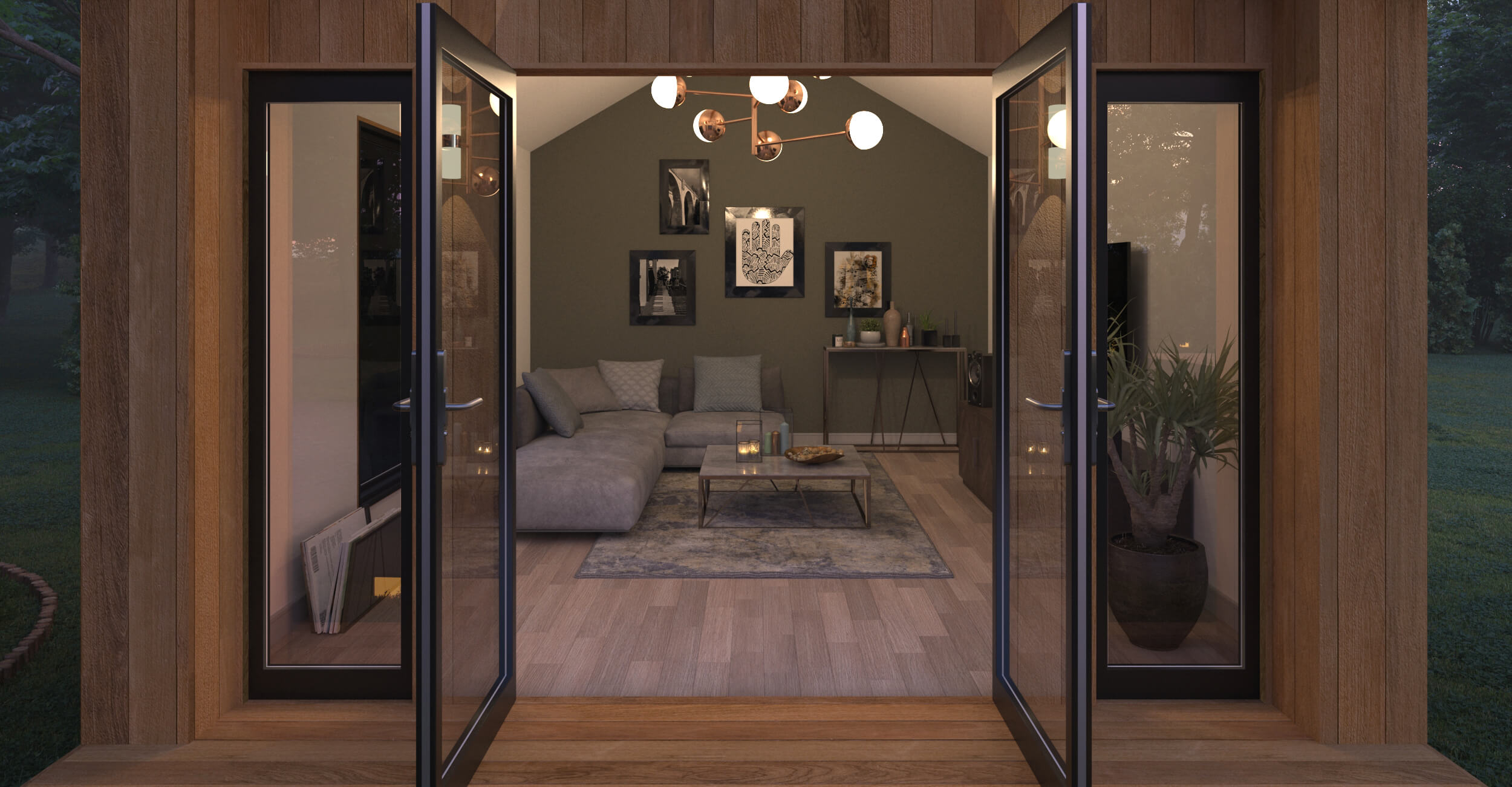 If you are seeking a garden room that lets in plety of natural light then there is no doubt that the Loughrigg garden room is the perfect choice for you. With one set of double doors and large fixed windows either side, plus a large window to the side elevation. Add to this the decking around the front and side of the garden room. This room can be adapted to suit all requirements, acoustic rooms, gyms and studios.