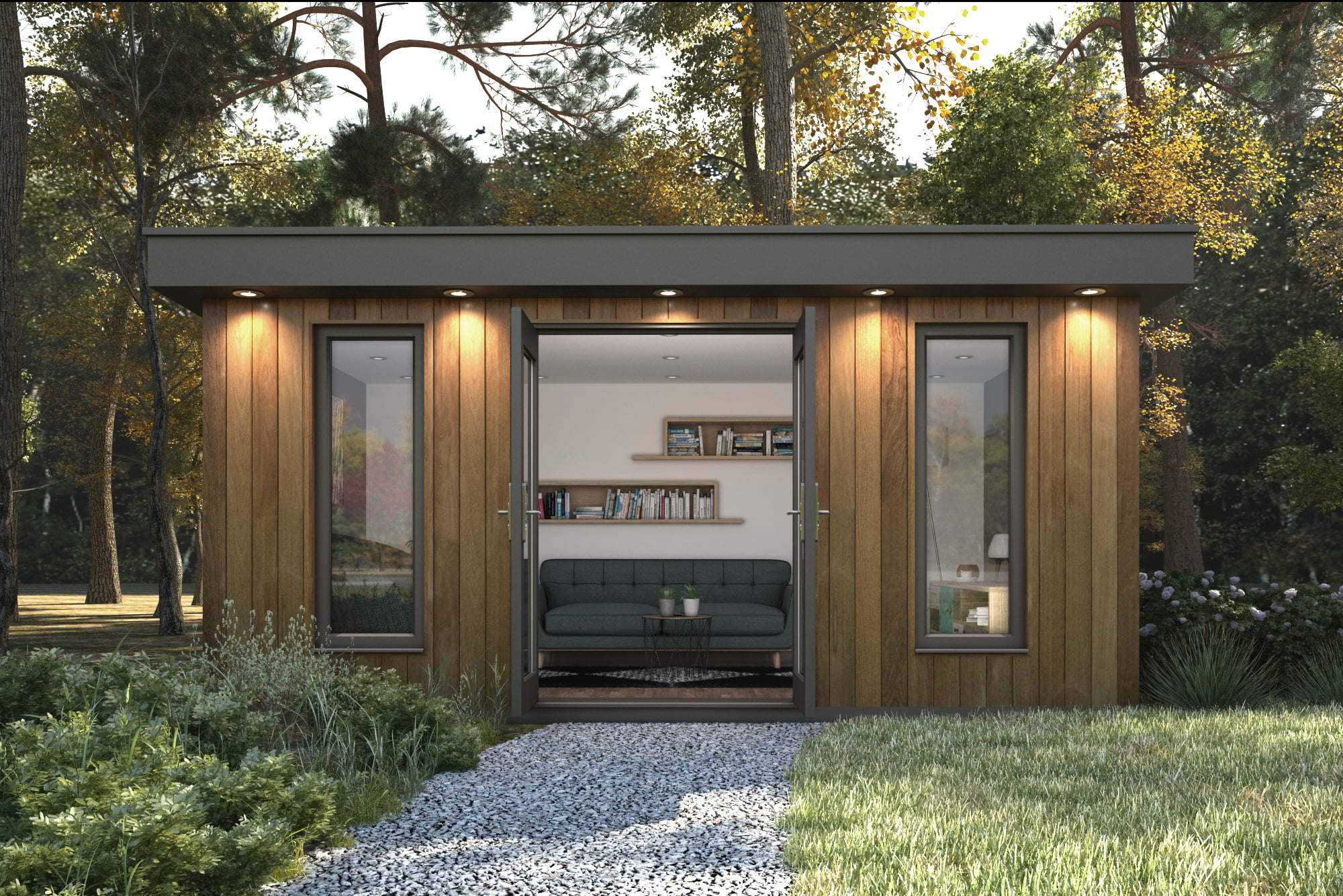 - Vertical clad design with premium western cedar timber